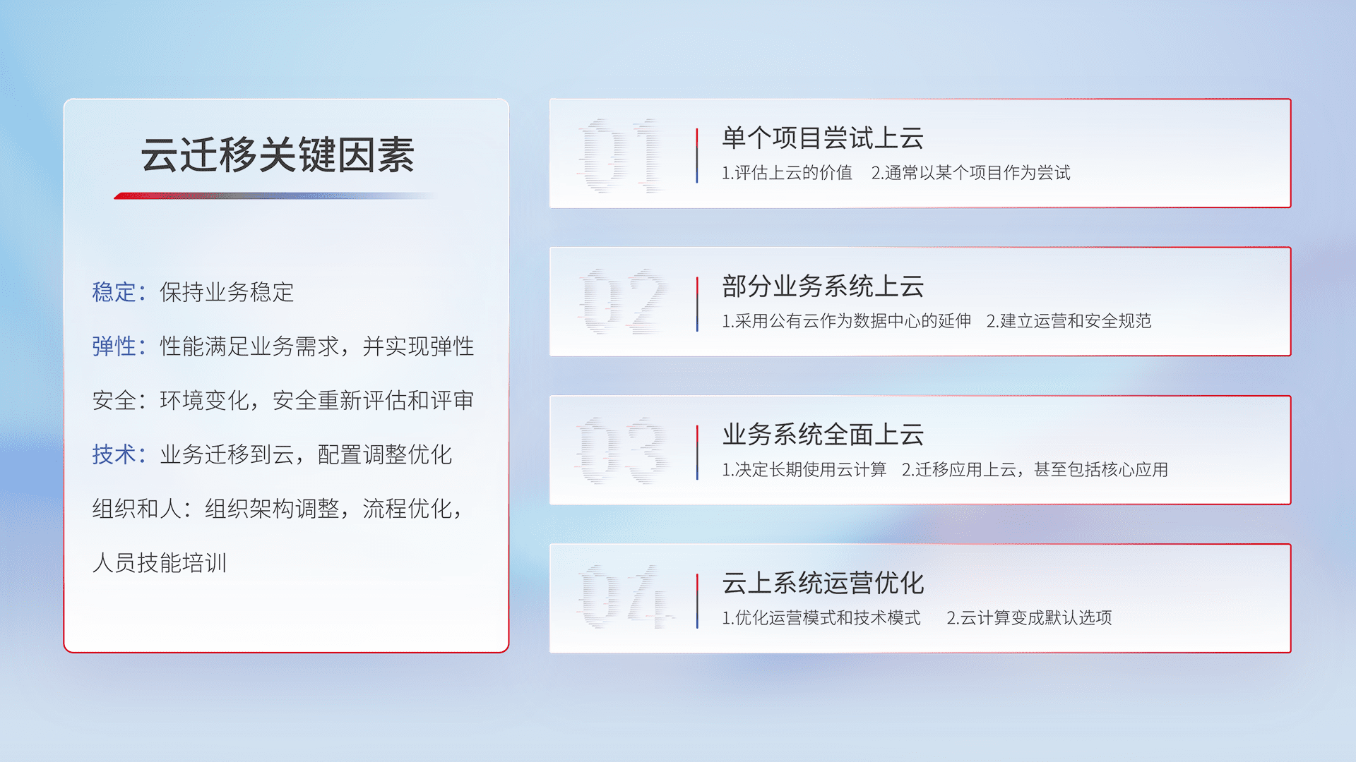 结合实际业务,,,,从规划设计、、、、云平台选型、、、云原生改造、、数据迁移、、、集成交付,,,,迁移全过程为客户识别最佳上云路径,,,,做好风险识别管理,,,设计网络架构、、身份权限、、、、安全审计合规、、操作审计、、、日志审计、、监控告警策略、、、、多站点容灾设计等,,对云上基础设施进行整体规划,,提升IT治理水平,,,,以满足弹性、、、、高可用、、、、高性能的需求。。。