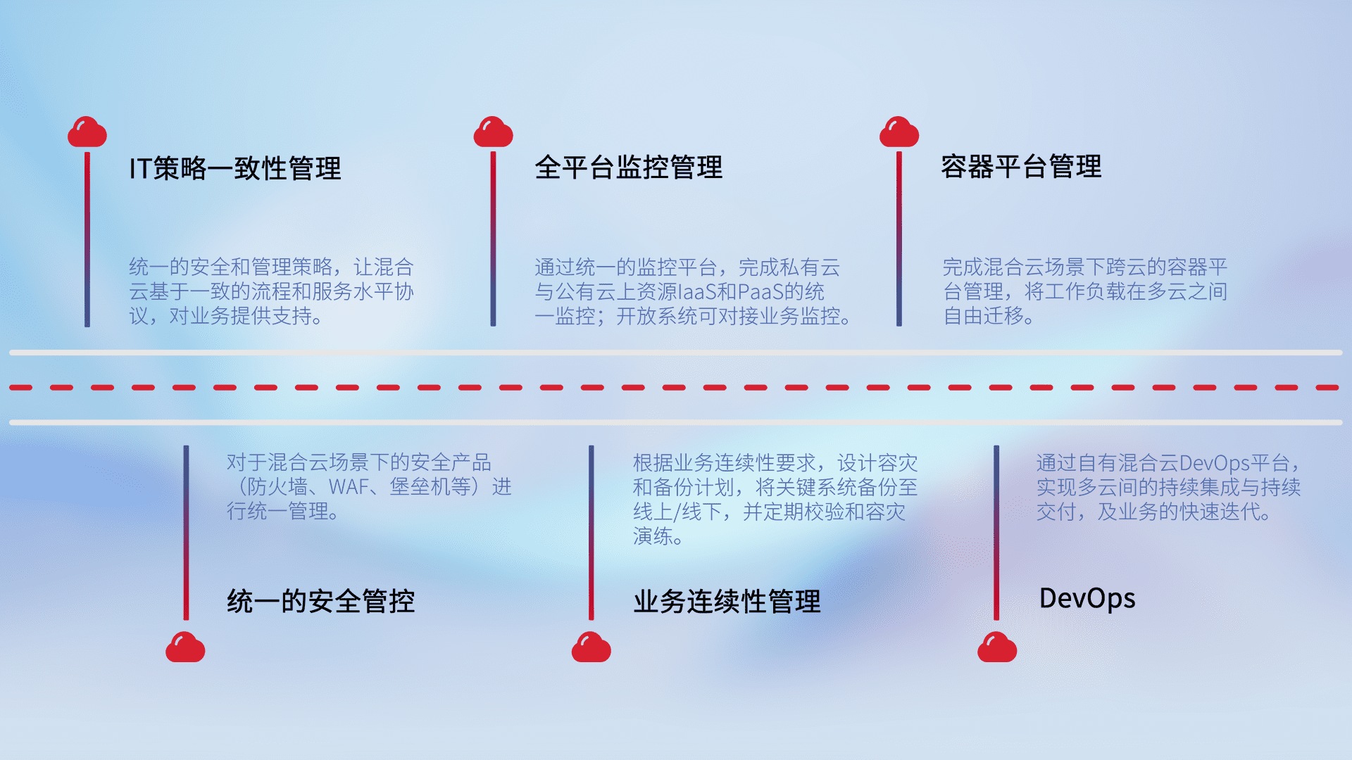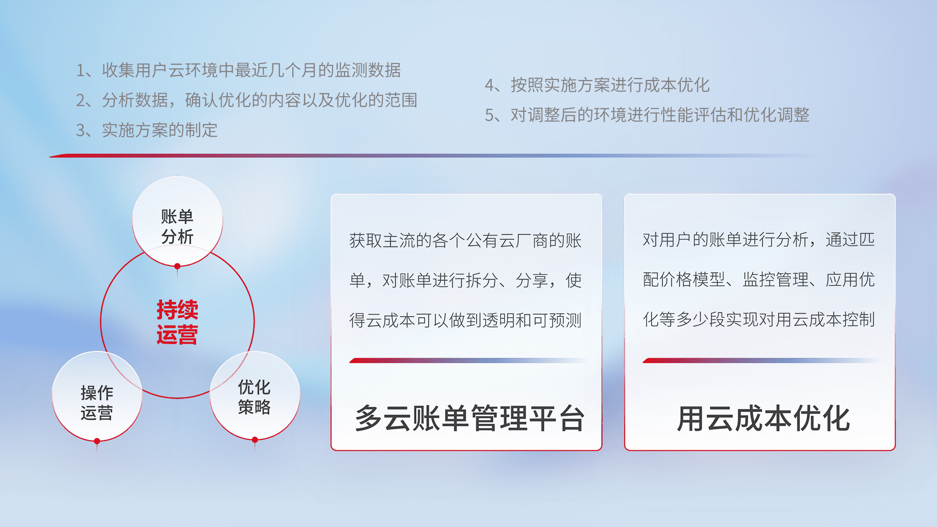 通过多云纳管,,以统一的资源数据模型把客户的云资源进行抽象和封装,,,进而实现对多云资源的统一操作,,,保障云资源管理的可靠性、、、稳定性与可用性。。。量身定制化运维内容,,,,配置、、、开发运维、、、、补丁管理、、备份、、、、监控、、认证和访问管理、、、、审计和日常巡检等,,,,保障在用云过程中的可靠度,,,,稳定度以及高可用率。。