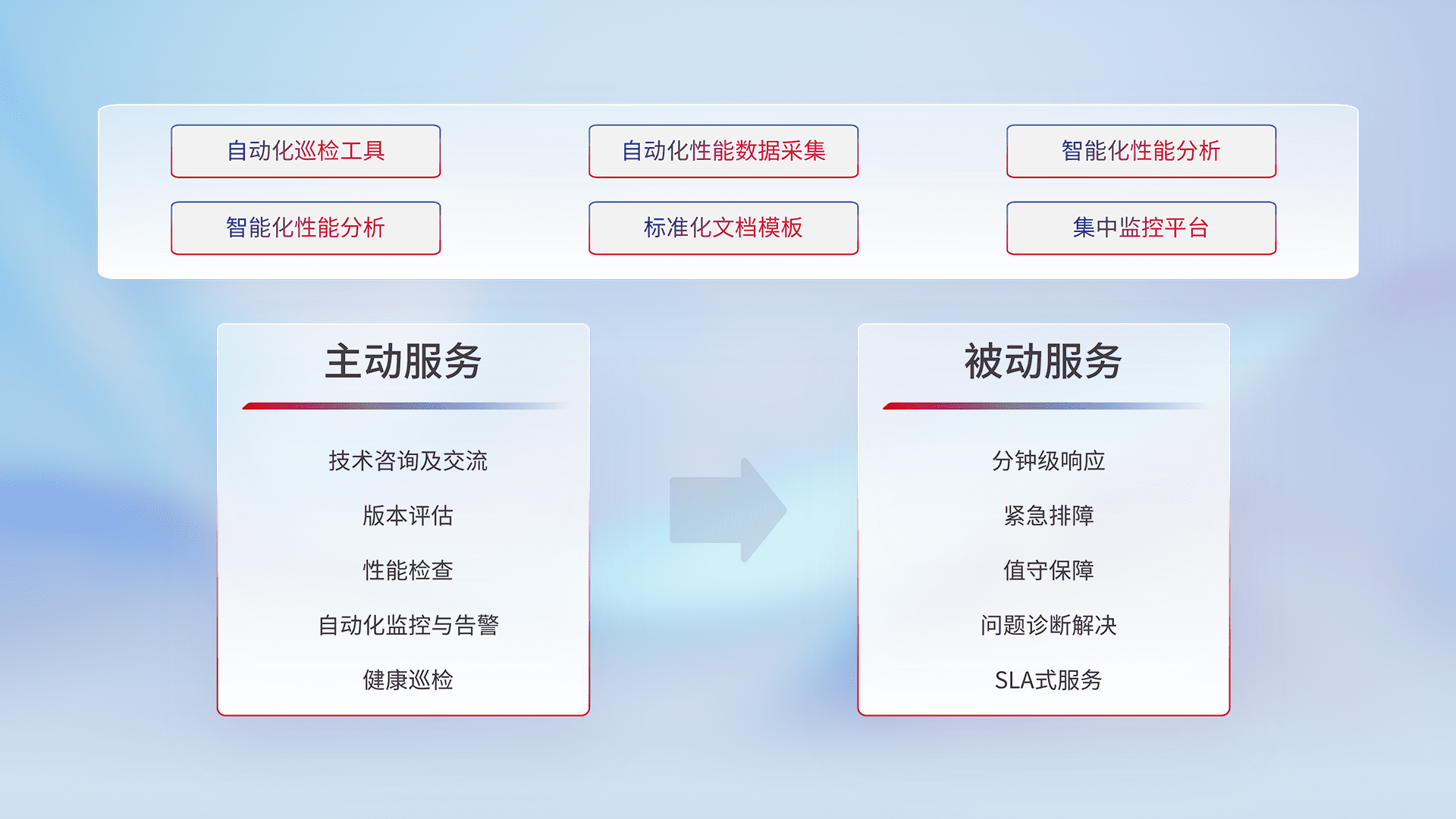 智能化工具和标准化文档,,保障服务质量,,提供主动服务(包含技术咨询、、、、版本评估、、、性能检查、、、自动化监控与告警、、、、健康巡检)和被动服务包含(分钟级响应、、、紧急排障、、、、值守保障、、问题诊断解决、、、SLA服务)。。